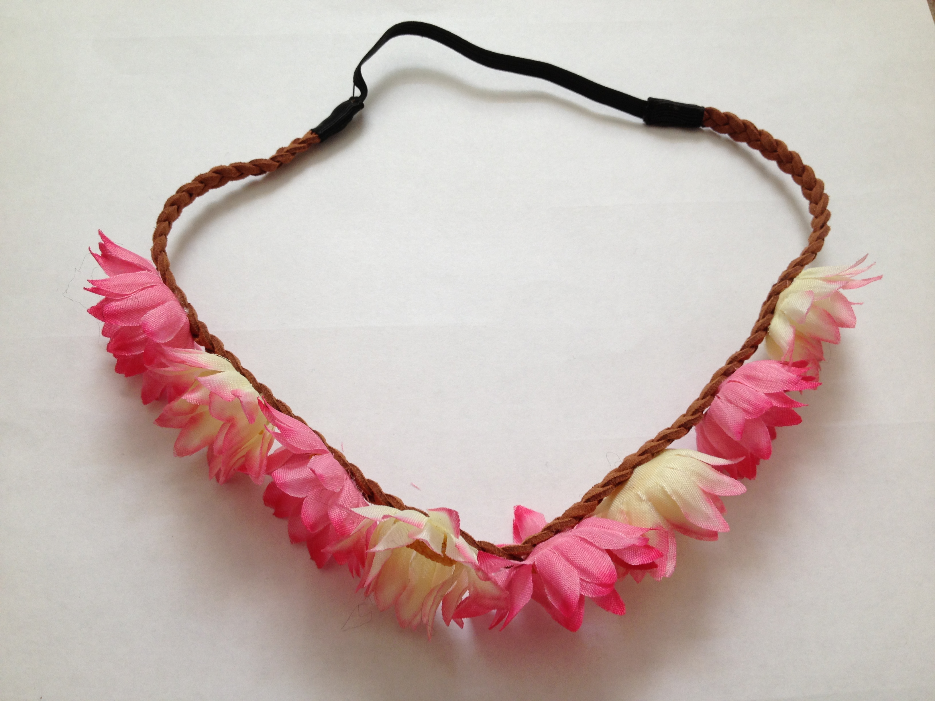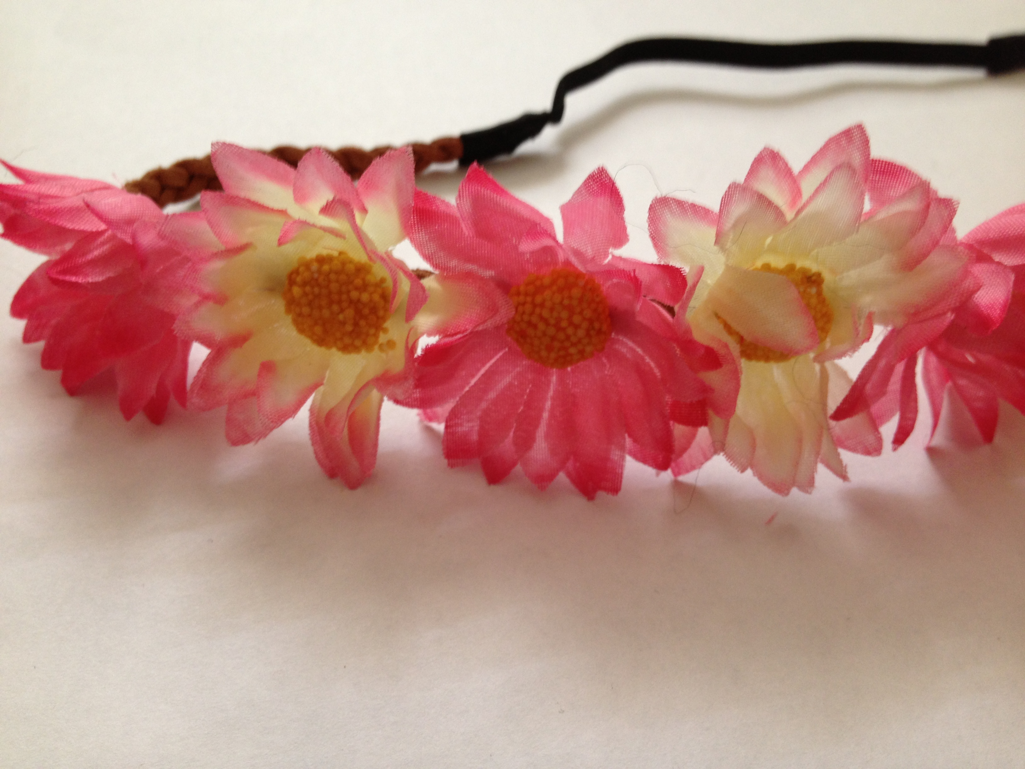 Flower crown decorated with pink and white daisies, held together by moccasin rope.
