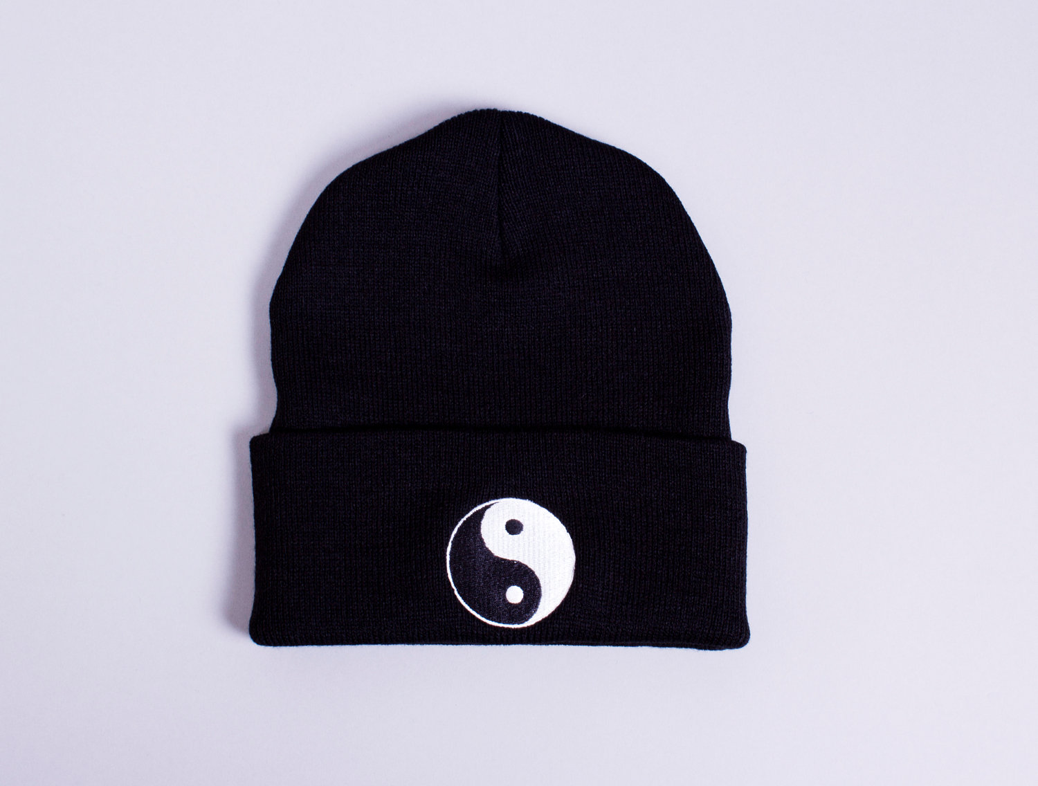 Super rad graphic beanie cap with the design of the Chinese yin yang symbol embroidered across the front.