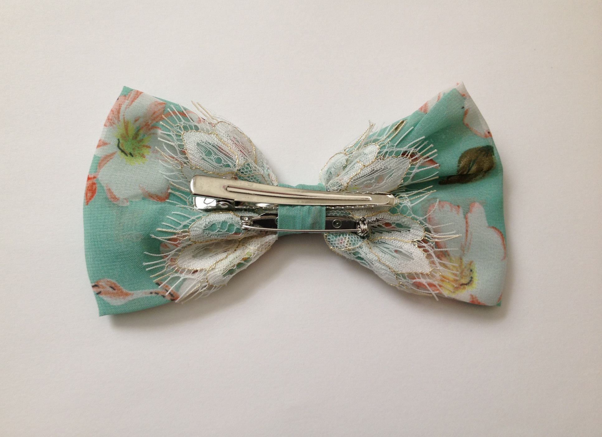 Lovely addition to your accessory collection. This magical, lightly colored hair bow is designed with floral print and lace material to go perfectly with your summer outfits!
